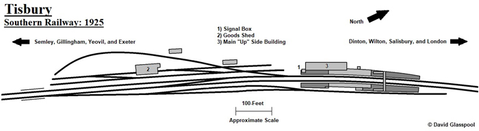 Goods facilities were concentrated at the Yeovil end of the layout, which included a rail-served goods shed on the "up" side of the line and a siding which terminated behind the "down" platform. Such is the complexity of the track formation that it is illustrated in the below diagram. A proportion of the goods traffic was generated by Tisbury Quarries, from where sandstone was extracted.