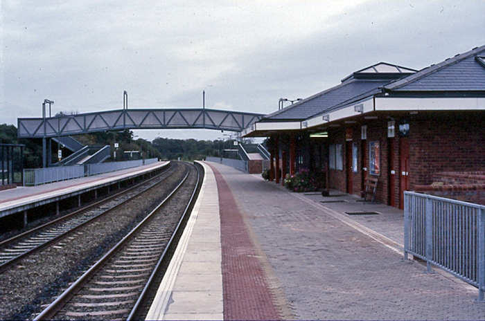 A southward view shows the brand new station before opening. The car park is behind the station building on the right, and the footbridge provided step-free access between both platforms. © David Glasspool Collection