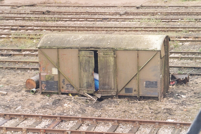 There are a few ventilated van bodies at the site, which presumably contain tools and spares. Up until the mid-1960s these would have been a common sight at the yard, but actually on the rails! This example, seen on 30th June 2004, is immediately to the east of the footbridge. © David Glasspool