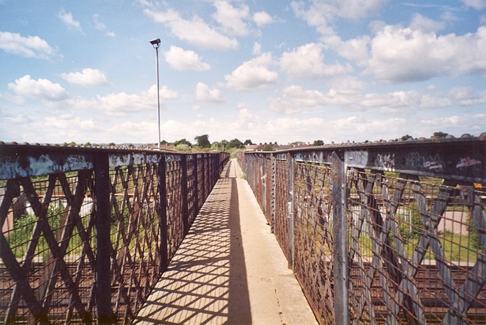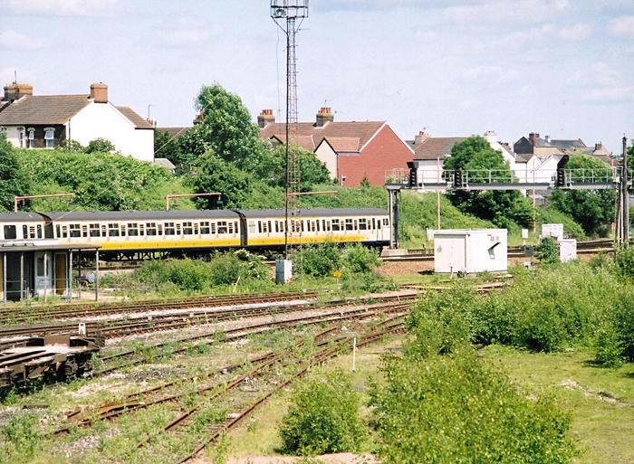 A prominent feature at the yard is the lengthy footbridge which crosses all tracks of the yard and those of the Tonbridge to Redhill line. A separate and far more modern footbridge is in place over the double-track line from Sevenoaks. The lengthy footbridge is seen on 31st May 2004. © David Glasspool