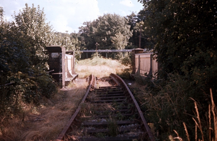 A southward view, around the time of closure, shows that seven sidings on the left had already been taken up, and ventilated vans flanked either side of the platform. The chimneys and most of the buildings in the background belonged to A. E. Reed's "Upper Mills". © Roger Goodrum