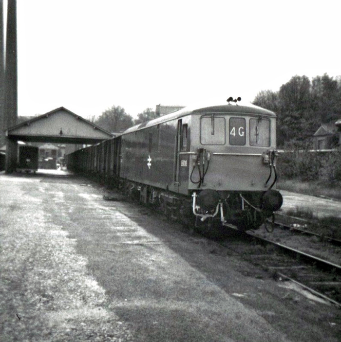 Wearing pre-TOPS number, Type "JA" No. E6016 (latterly Class 73 No. 73110) is seen fronting a train of vans, likely to be bound for Tonbridge West Yard via a reversing manoeuvre in the goods yard at Maidstone West. © Roger Goodrum