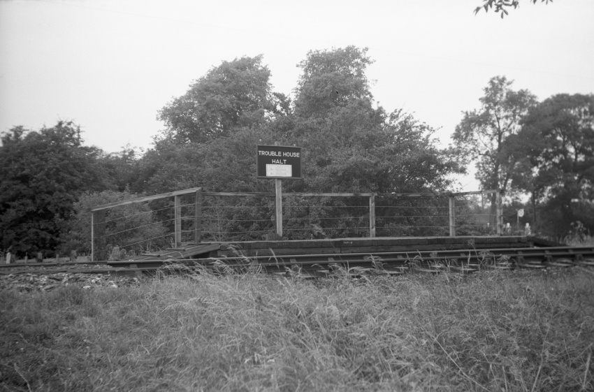 The circumstances surrounding the opening of this tiny station must surely be unique, at least for the time. Once located upon the 7¼-mile single-track branch line that linked Kemble with Tetbury, both in Gloucestershire, this timber-built halt — about half a BR Mk 1 carriage-length — was commissioned to serve a nearby historic inn. Naturally, it was from the latter which the halt took its name. The Trouble House Inn is located on the main road between Cirencester and Tetbury and, as recalled in The Birmingham Post on Saturday, 30th July 1960, a series of tragic incidents at the site dating from the 1600s onwards gave rise to the “Trouble” portion of the name. The inn also had the nickname Treble House, because the building was made up from three former cottages.