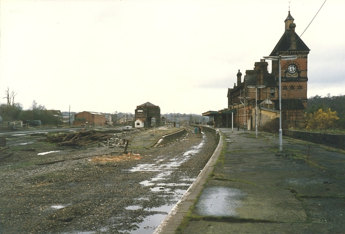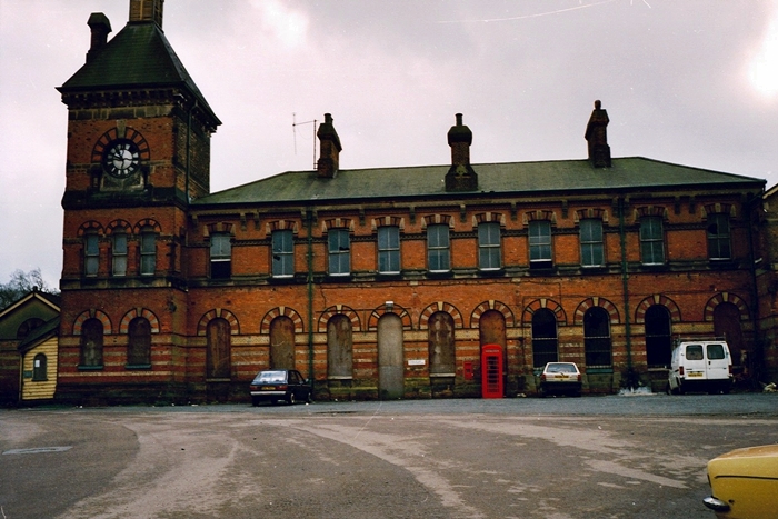 The impressive station building is seen from the entrance road in March 1989, after closure, with most of the lower windows boarded up. The façade canopy had also gone, but the small add-on appendices to the left of the tower remained. © Mike Glasspool
