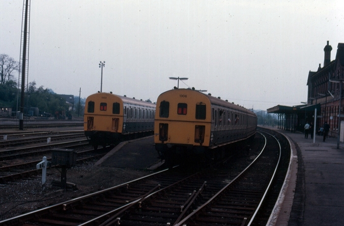 We now fast forward to the final day of service. From left to right, ''Thumpers'' Nos. 1302 and 1306 are in attendance, the latter packed full of enthusiasts. By this time, the island platform canopy had gone, and that extending from the station building had been severely truncated. The latter had also seen the attractive ''spikes'' of its valance sawn off. © David Glasspool Collection