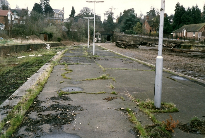 The eastern signal box was still in place in March 1989, but it had been completely gutted of all equipment, and all that remained was the timber frame - even the windows had gone. The single-track tunnel, deemed a necessity by Parliament in 1864, is seen beyond the signal box and road bridge. The connecting spur with the SER joined approximately ¼ mile south of Tunbridge Wells Central and took an immediate sharp turn westwards towards the LB&SCR's West station. A map of this area reveals that the cutting of the single-track line is still very much in existence. © Mike Glasspool