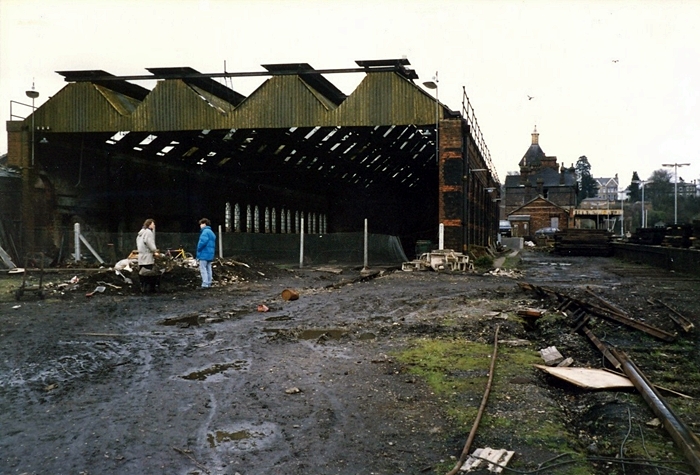 After closure to steam locomotives, the engine shed found a new lease of life as covered storage for rolling stock. Here the former engine shed, fenced off after lifting of the tracks, is seen with its 1950s BR asbestos roof. © Mike Glasspool