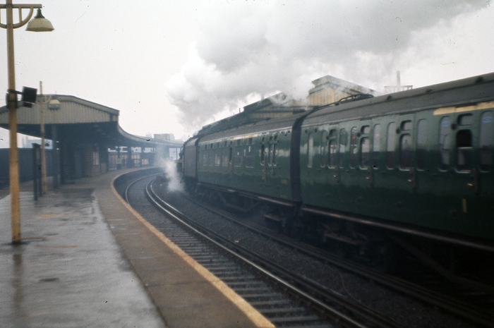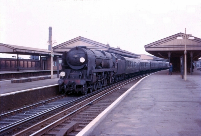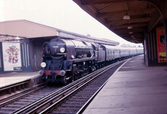Sailing through: Rebuilt Bulleid Light Pacific No. 34108 ''Wincanton'' is seen nearing journey's end with a train from Bournemouth. On the left can be seen the gap which separates the two sections of canopy over platform Nos. 5 and 6 - note, however, that in absence of the canopy, the lattice underhang still exists. The photograph is taken from the present day platform No. 4. Interestingly, the canopy end plates are of different shapes: at the southern end (behind the carriages), the canopy is finished with a triangular cross-section, whilst where the middle part of the canopy has been removed, the end-plates are trapizium-shaped. Hexagonal lampshades abound. © David Glasspool Collection