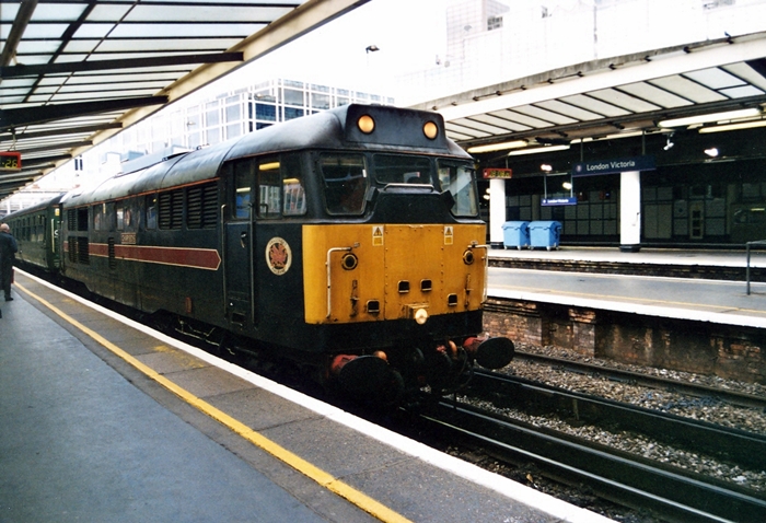 The day begins: Class 31 No. 31128 ''Charybdis'' hauls the ''Green Train'' into platform 2 at London Victoria.