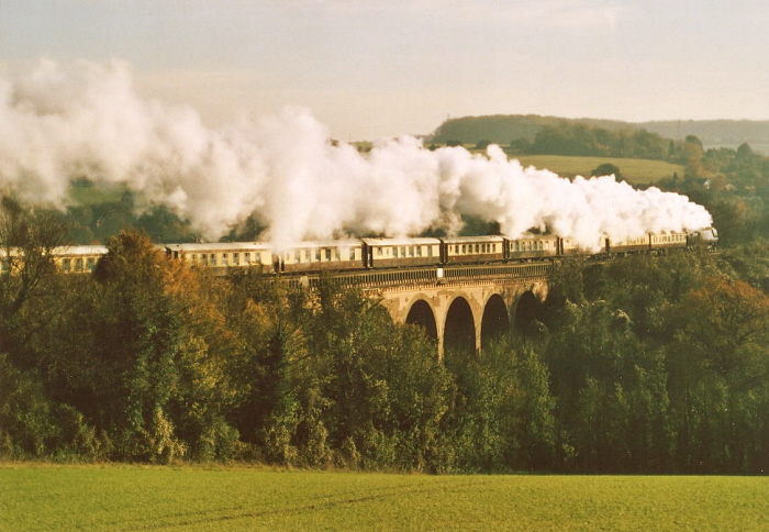 This view depicting the Orient Express flying over Eynsford Viaduct illustrates what preservation is all about. This is the 11:45 working from London Victoria to Folkestone West, with a scheduled arrival time at the latter of 15:15. At the helm is Un-rebuilt Battle of Britain Class No. 34067 ''Tangmere'', complete with support coach in the form of a BR Mk 2a. © David Glasspool