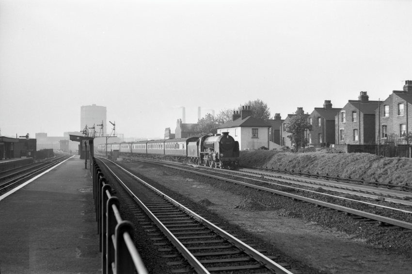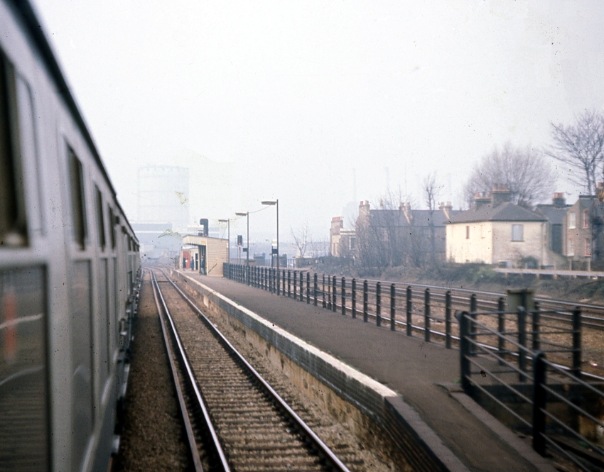 Bulleid-designed 2 EPB No. 5684 is seen approaching from Stewarts Lane, empty stock to Selhurst. The black triangle on the cab front indicated that there was no brake compartment at the opposite end of the unit. The timber waiting shelters dated from the station's earliest days and met their end when the footbridge was installed. © David Glasspool Collection