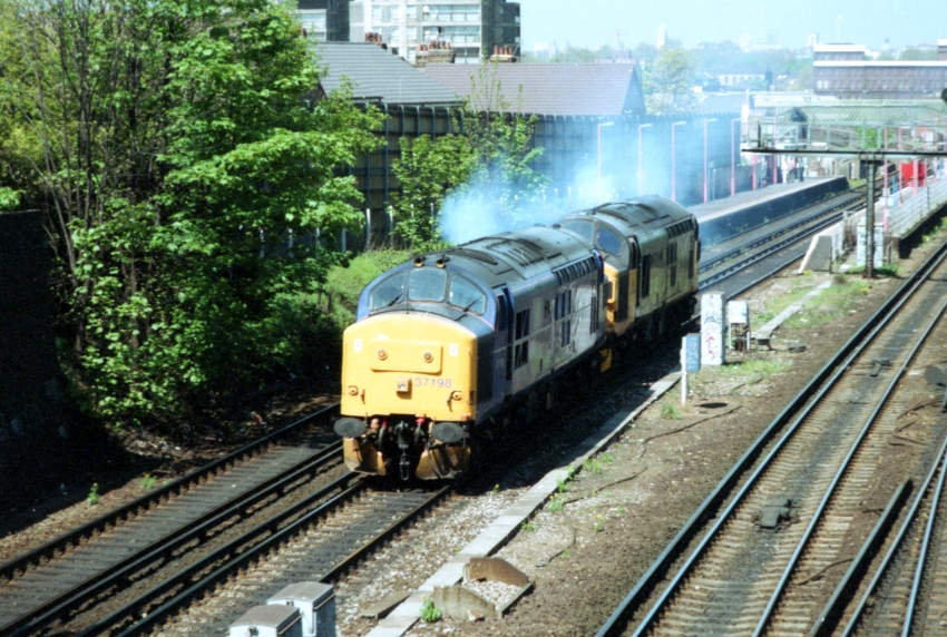 Class 37 Nos. 37198 (in "Mainline" blue livery) and 37025 (in BR "Large Logo" colours, albeit minus the "Large Logo" emblem) are seen just after passing the station, heading southbound. It is likely that the pair were Hither Green-bound. By this time, the area behind platform 1, formerly occupied by the LB&SCR's Station Master's house and garden, and been redeveloped into housing. © David Glasspool