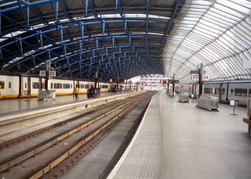 This is a southward view from platform 23 beneath the roof's 1,000 tonnes of steelwork, two acres of stainless steel cladding, and two-and-a-half acres of glass. © David Glasspool Collection