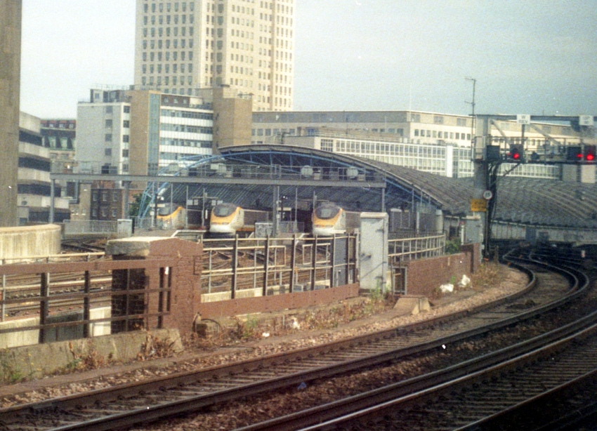 Three Trans Manche Super Train sets are seen stabled under the distinctive curved trainshed of Waterloo International on 21st July 2005. Note the structure begins to taper on the right, where it is framed by the colour light gantry. © David Glasspool