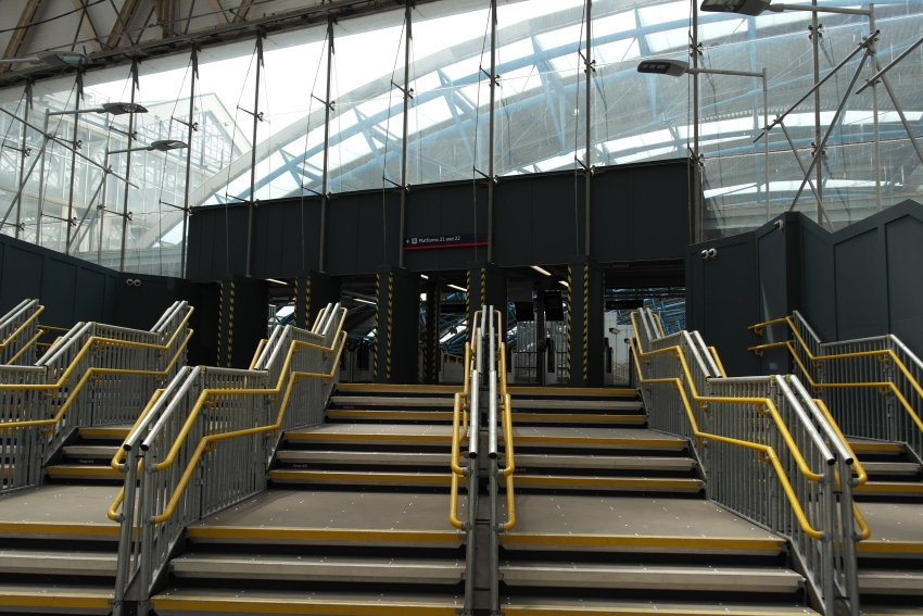 In 2014, flights of stairs were erected above the former ''low-level'' concourse to provide access to platform Nos. 21 and 22, as part of works to convert the terminal to domestic use. Platform 20 was already reachable through a series of holes made in the dividing wall between it and platform No. 19. © David Glasspool