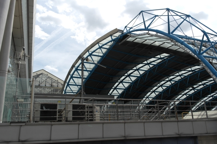 The curved roof of the former international terminal has never had a flush connection with the ex-LSWR terminus, leaving a gap of about 35-feet. As a result, a rather crude flat-roof metal canopy has been erected in line with the new staircases, to protect passengers from the elements over this exposed section. Swaithes of palisade fencing has also appeared within the arched trainshed. © David Glasspool