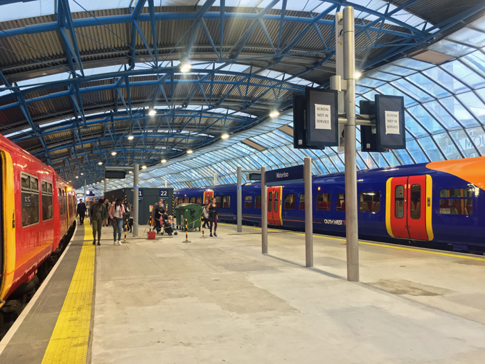 A southward view from platform Nos. 21 and 22 shows Class 455 and 458/5 units on the left and right respectively. The dark grey hoarding in the background surrounded a former staircase entry to the platforms from the ground floor. © David Glasspool