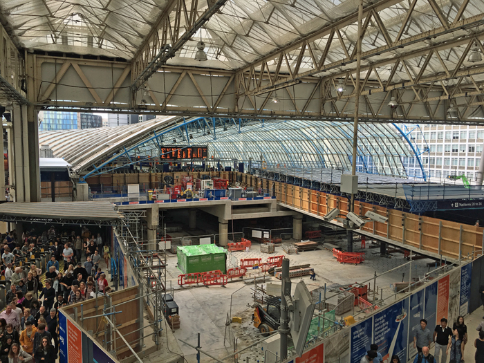 The £800 million scheme to increase capacity at Waterloo by 30% involved lengthening platform Nos. 1 to 4 inclusive to accommodate ten-car suburban services. For these works, platform Nos. 1 to 10 were closed from 5th August to 28th August. To partially make up for the loss of station capacity, platform Nos. 20 to 24 of the former international station were brought into use for domestic traffic. In this view, it can be seen that a concrete bridge had been built from the former international terminal to the main station concourse. © David Glasspool
