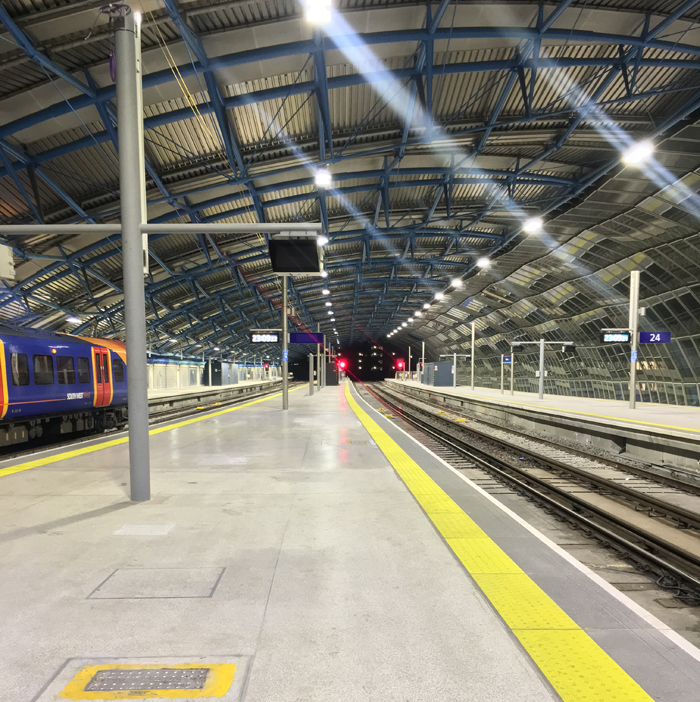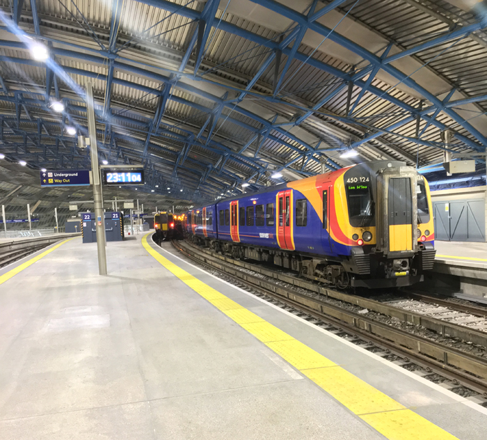 A southward view shows how long the platforms are: a ten-car Class 450 formation, left, is nowhere near the end of the trainshed. In the distance, hoardings can be seen around staircases which formerly gave access to the low-level. © David Glasspool