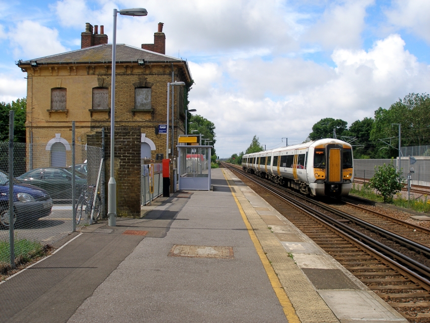 A westward view shows Class 375 No. 375712 running Dover Priory-bound. The unit is passing the site of the "down" side goods yard, which consisted of a single siding serving an elevated platform and goods shed. The differing shades of brickwork of the main station building are obvious in this view, and the red brick chimneystacks are also witnessed. © David Glasspool