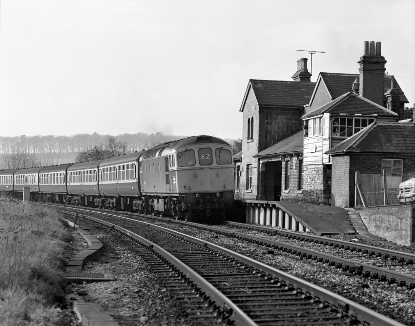 About fourteen years had passed since closure by the time of the above view, but both the former station building and the then still active signal box remained in remarkably good condition. This view shows to good effect the slate-hung tile finish of the main building's walls, a feature shared with the likes of Tisbury and Gillingham. Class 33 No. 33013 is seen rounding the curve with an Exeter St Davids to Waterloo service, a mixture of BR Mk 2a and Mk 1 stock in tow. The "down" platform had gone, but the double-track persisted just beyond the River Wylye, west of the former station site. The stone base of the signal box, and a later extension of the upper storey, is evident here; the timber cabin now resides on the Mid-Hants Railway at Medstead & Four Marks station. Although the station building lacked a canopy, there was a roof overhang facing onto the platform — as shown here — under which passengers could take refuge. John Vaughan / © David Glasspool Collection
