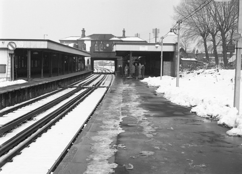 An Elmers End-bound view shows a snowy scene and a busy "down" platform (right). At the far end of the "up" platform (left), immediately in front of the main station building, can be seen a four-aspect colour light. Some time between late 1955 and this photograph being taken, the colour light replaced a double-height semaphore post; the latter had a signal arm just below the canopy, at the level of the replacement colour light, and a second arm above road level, around the roof line of the main building. This explains the column of white paint which was applied to the main building, so the former semaphore signals were easier to decipher by drivers. The colour light was supplemented by a banner repeater disc at the end of the canopy, left, which came into use at the same time as the former. Beyond the road bridge can just be seen a trailing crossover between the running lines and a "down" side semaphore signal. In spite of the "up" side colour light mentioned, the remaining signals at the station – including those for the junction – continued to be traditional semaphores. A track foot crossing for staff existed between the platforms, a break in the conductor rails being evident here, and the same style of "high-level" station building had come into use at Clock House in 1890. The bracket lampposts and "Sausage" Totems seen here were post-1955 additions, replacing SR Barley Twist Swan Neck lamps with "Target" name signs. Around the same time, both canopies acquired the plain timber valances seen here. A. Jackson © David Glasspool Collection