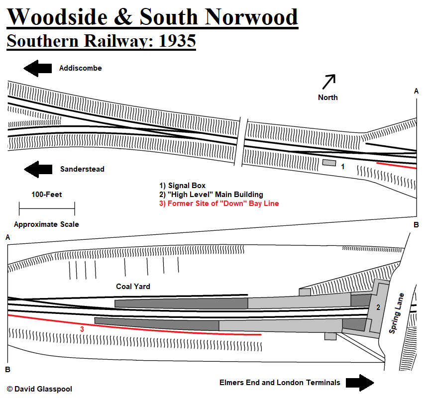 From Monday, 1st October 1908, the station was renamed "Woodside and South Norwood". By 1912, one of the "up" side stub sidings had been lengthened in the London direction, behind the platform, to serve a coal yard. Revised connections between the sidings and "up" running line were also made.