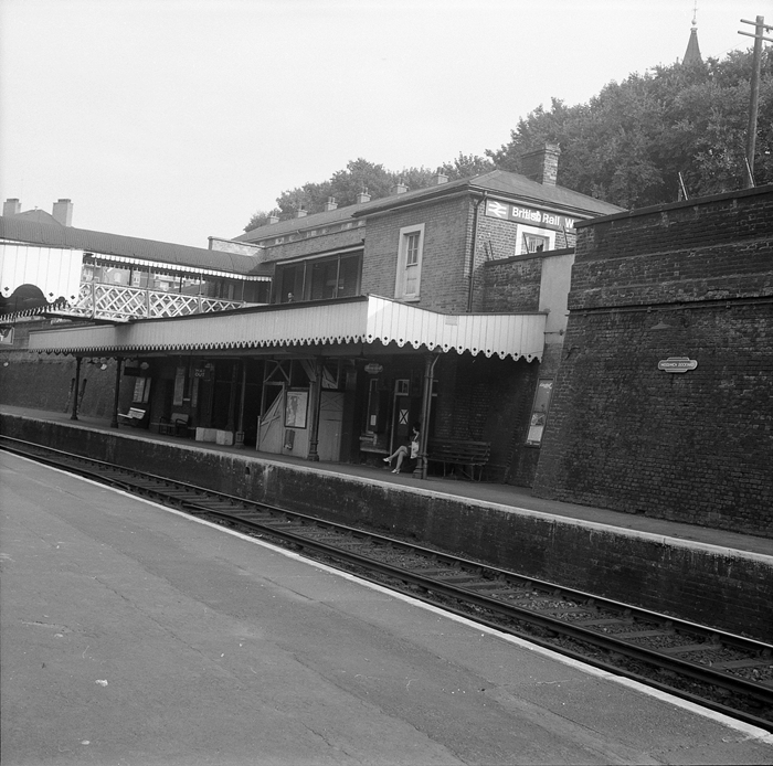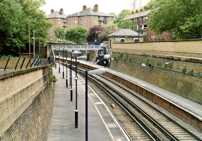 An eastward view shows the brick-lined cutting which the platforms and running lines are located within. The sole surviving "up" side structure (the "western appendix") can clearly be seen, admittedly in good condition. The lattice footbridge remains, albeit devoid of its roof; the bus shelters either side of it replaced a traditional SER canopy. Evidence of renewed brickwork can be seen on the upper walls, whilst the developments of the 1960s and 1970s are all too apparent in the background.© David Glasspool